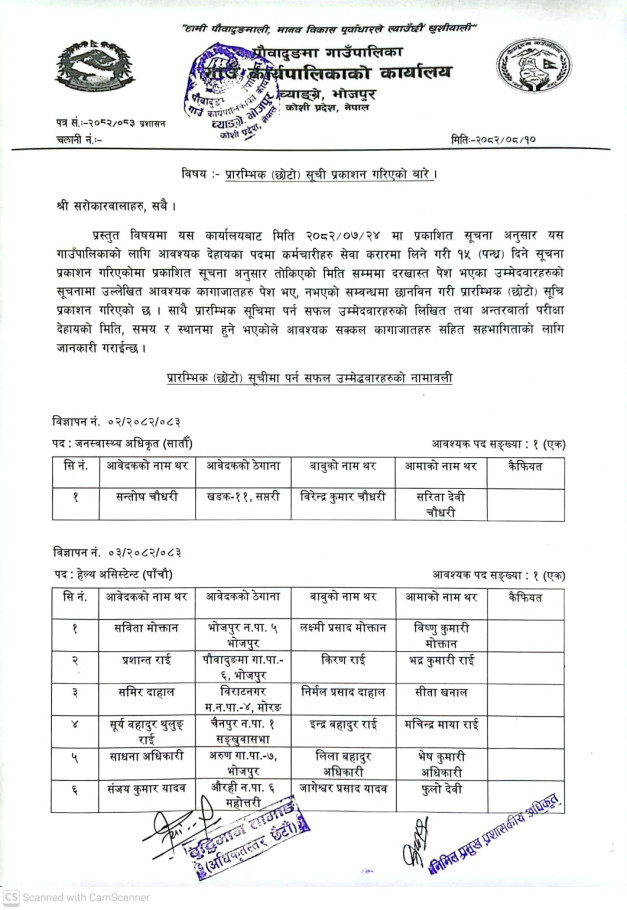 प्रारम्भिक (छोटो) सूची प्रकाशन गरिएको बारे ।