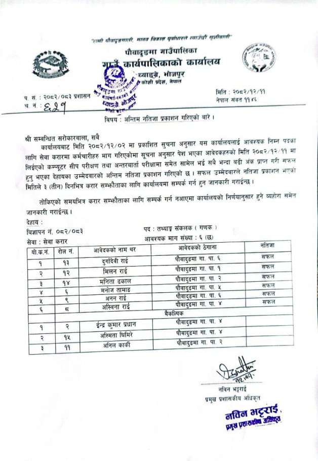 अन्तिम नतिजा प्रकाशन गरिएको बारे ।