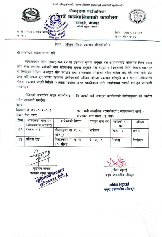 अन्तिम नतिजा प्रकाशन गरिएको सम्बन्धमा ।