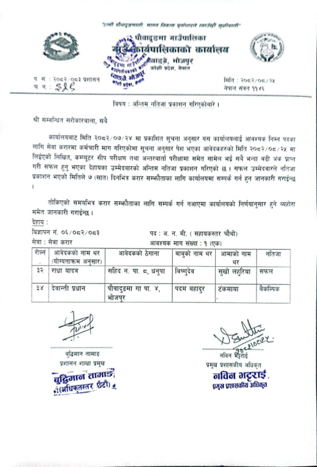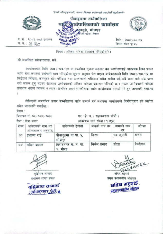 अन्तिम नतिजा प्रकाशन गरिएको सम्बन्धमा ।